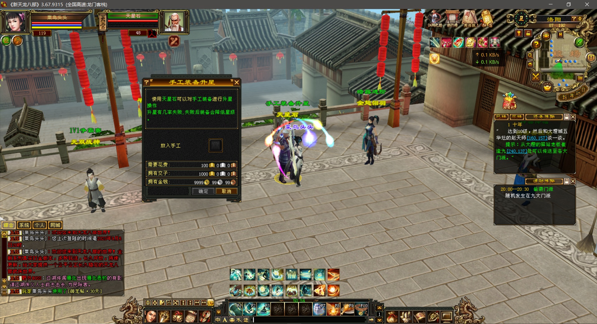 天龙八部单机一键端无任何验证,客户端流畅不卡顿,完整银行,大背包,天机,远程功能,自动挂机,万能传送,曼陀山庄,武道二重,灵武,修炼,武魂,兽魂,珍兽装备,珍兽渡劫,1V1,3V3,集卡,雕文,手工升星等等。